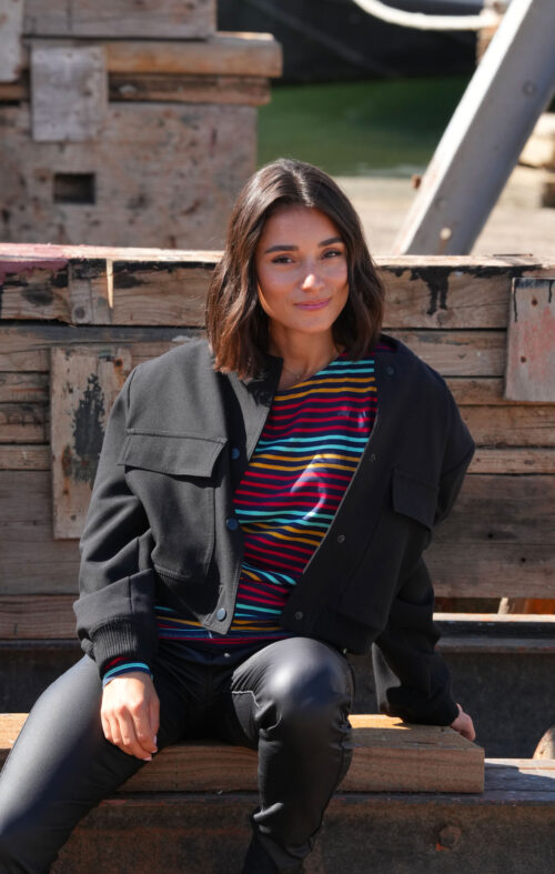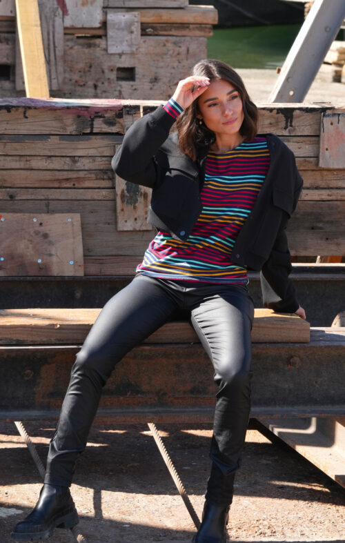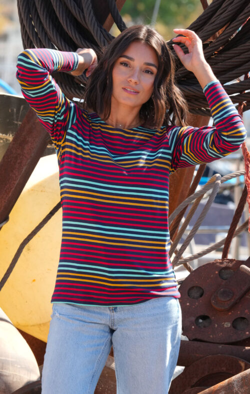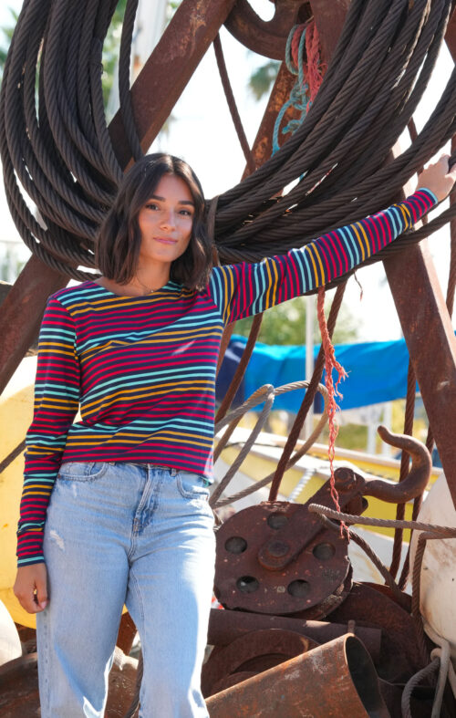 Rayures multicolores tricotées sur fond marine